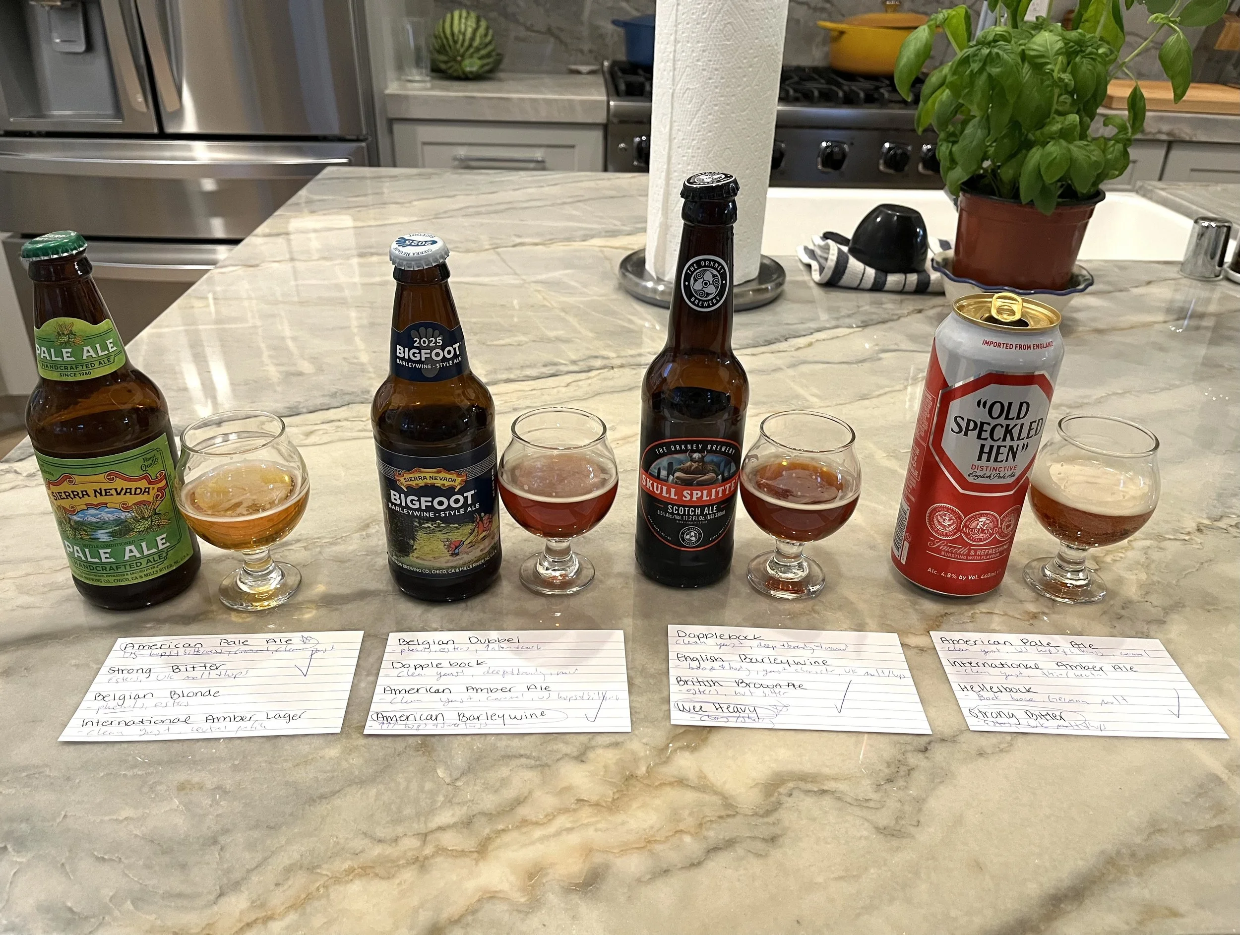 Another aroma giveaway here: none of the phenolic/ester yeast character of a Belgian beer (eliminating Dubbel) and tons of aromatic American hops (eliminating Doppelbock). A quick taste test to determine bitterness was enough to differentiate between American Amber and American Barleywine. Not soon after putting this beer in my mouth, I was overwhelmed by assertive hop bitterness and mountains of malt sweetness. The intensity was extremely high, so I knew it had to be American Barleywine.