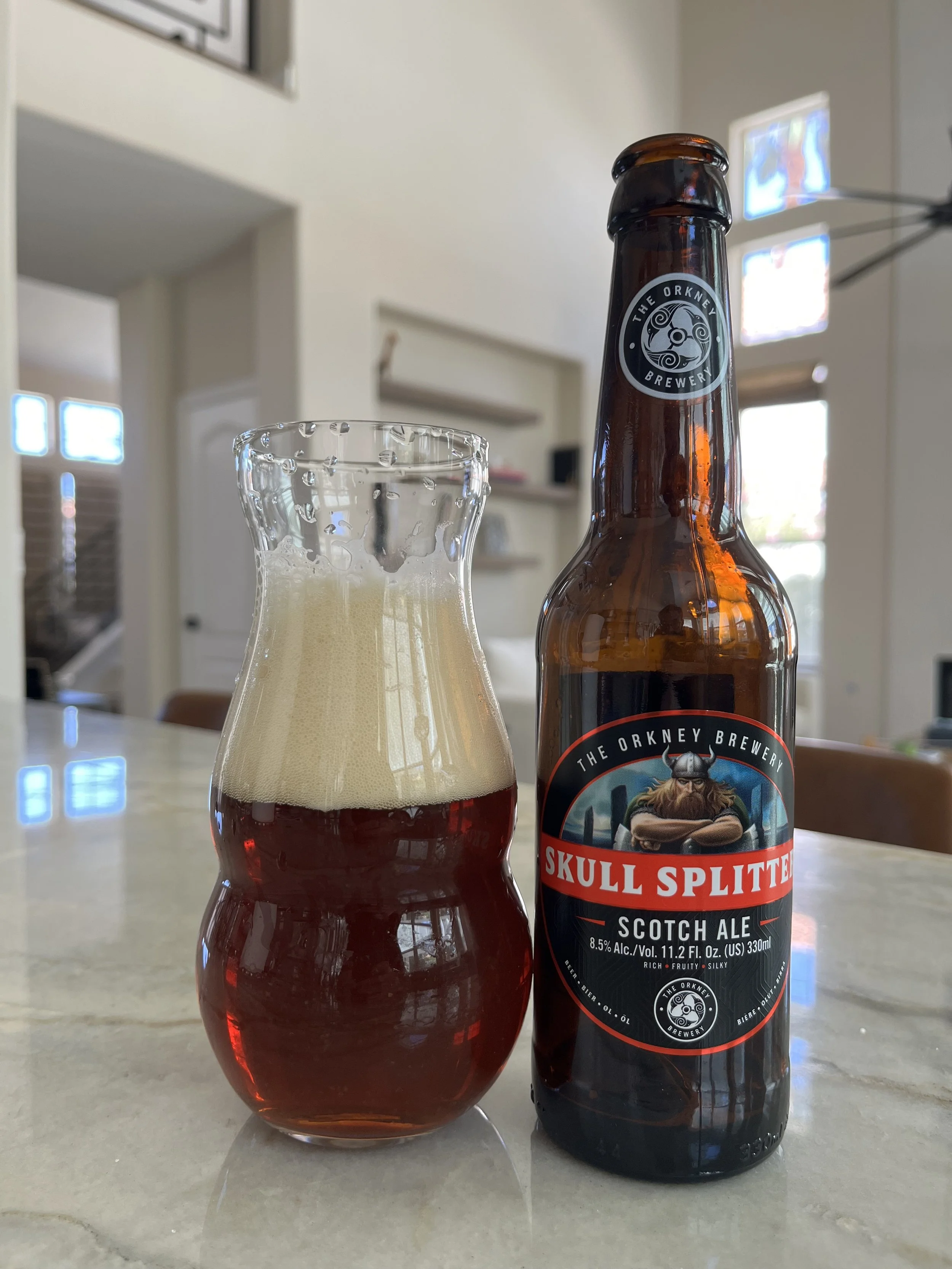 This is interesting because the alcohol percentage in the first two Wee Heavies I tasted, Bellhaven 90 and Traquair House Ale, were the same or lower than all the Doppelbocks: Korbinian is 7.4%, Maximator 7.5%, and Salvator 7.9%, while Bellhaven is 7.4% and Traquair is 7.2%. To get a higher ABV, more malt must be used, but the reason Doppelbocks can have more malt yet less sweetness is because of body and balance. The mouthfeel sensation of residual sugars found in a Wee Heavy creates the perception of heaviness on the palate, and the lack of balancing hop bitterness further accentuates this sweetness. Fruity esters coming from yeast add another layer to this, creating a rum-soaked-plum vibe that is boozy, sweet, and heavy. In the 8.5% Skull Splitter, this mouth coating sweetness and booziness was especially present.